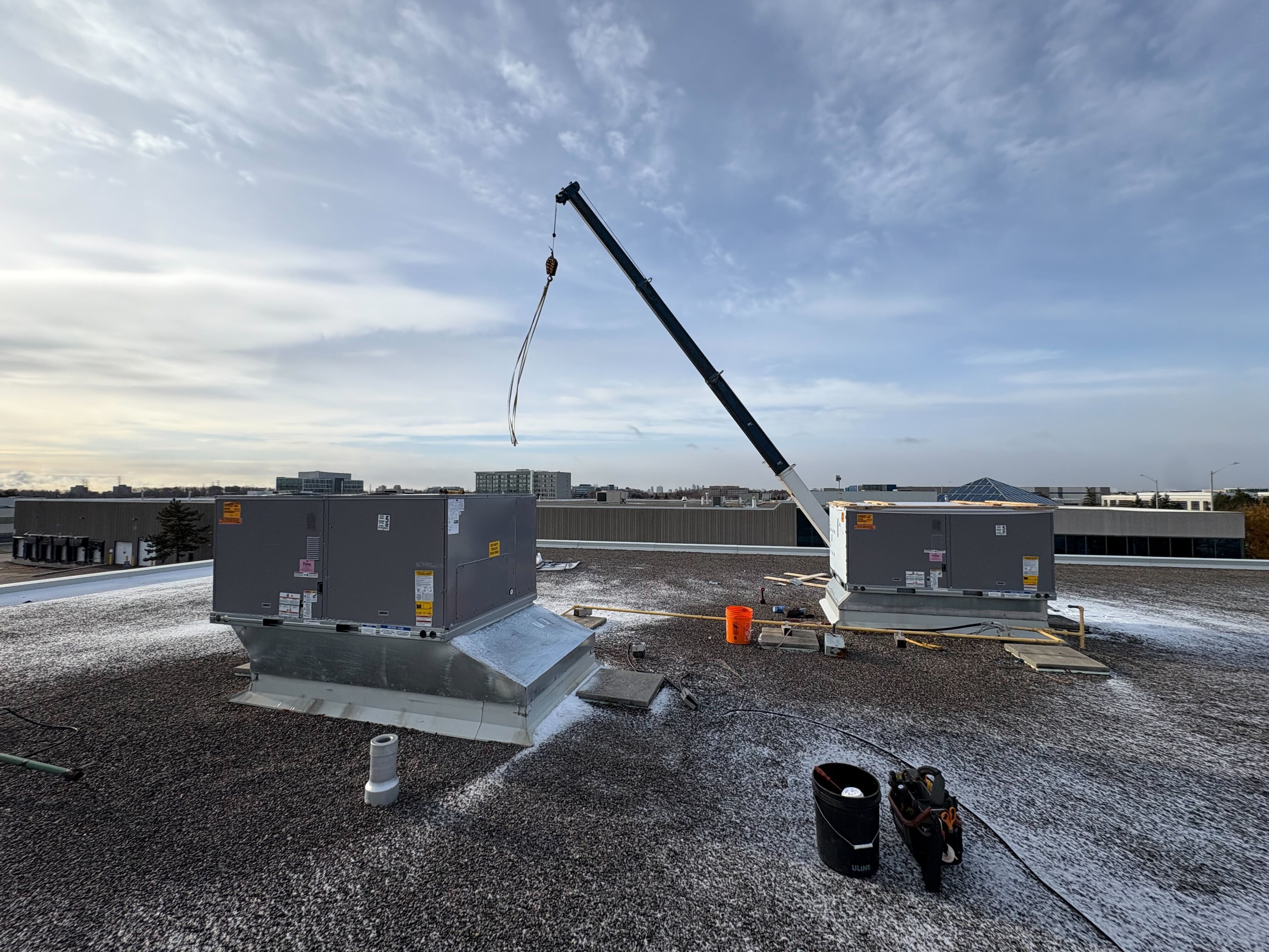 Two brand-new 7.5-ton Carrier rooftop units being installed. Another upgrade delivered by the Lisi Services team.